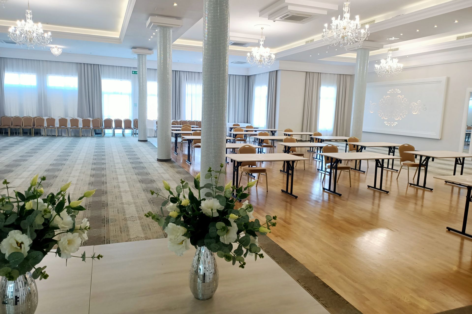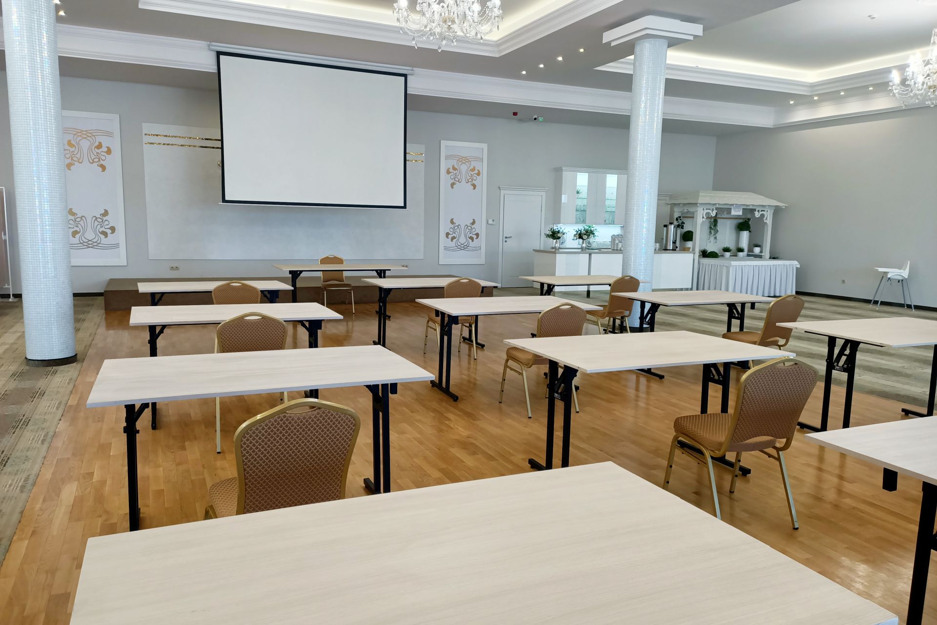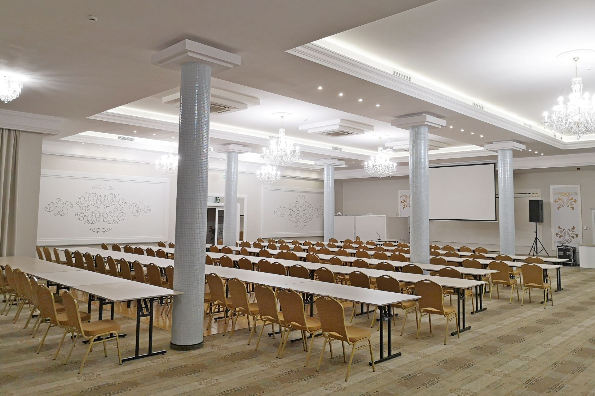 Wyposażenie sali: ekran, projektor multimedialny, flipchart, mikrofon, klimatyzacja, internet bezprzewodowy, mównica (na życzenie klienta).